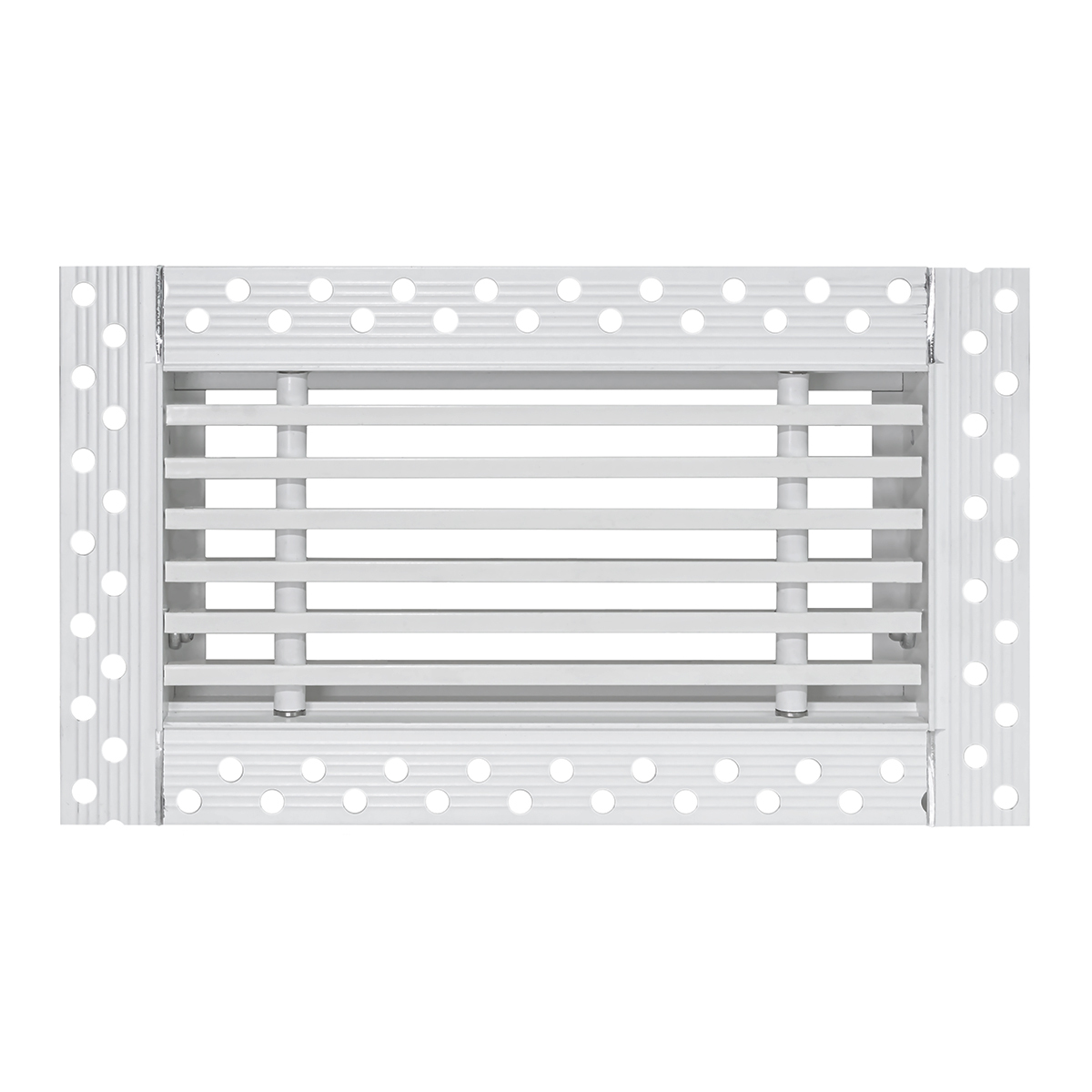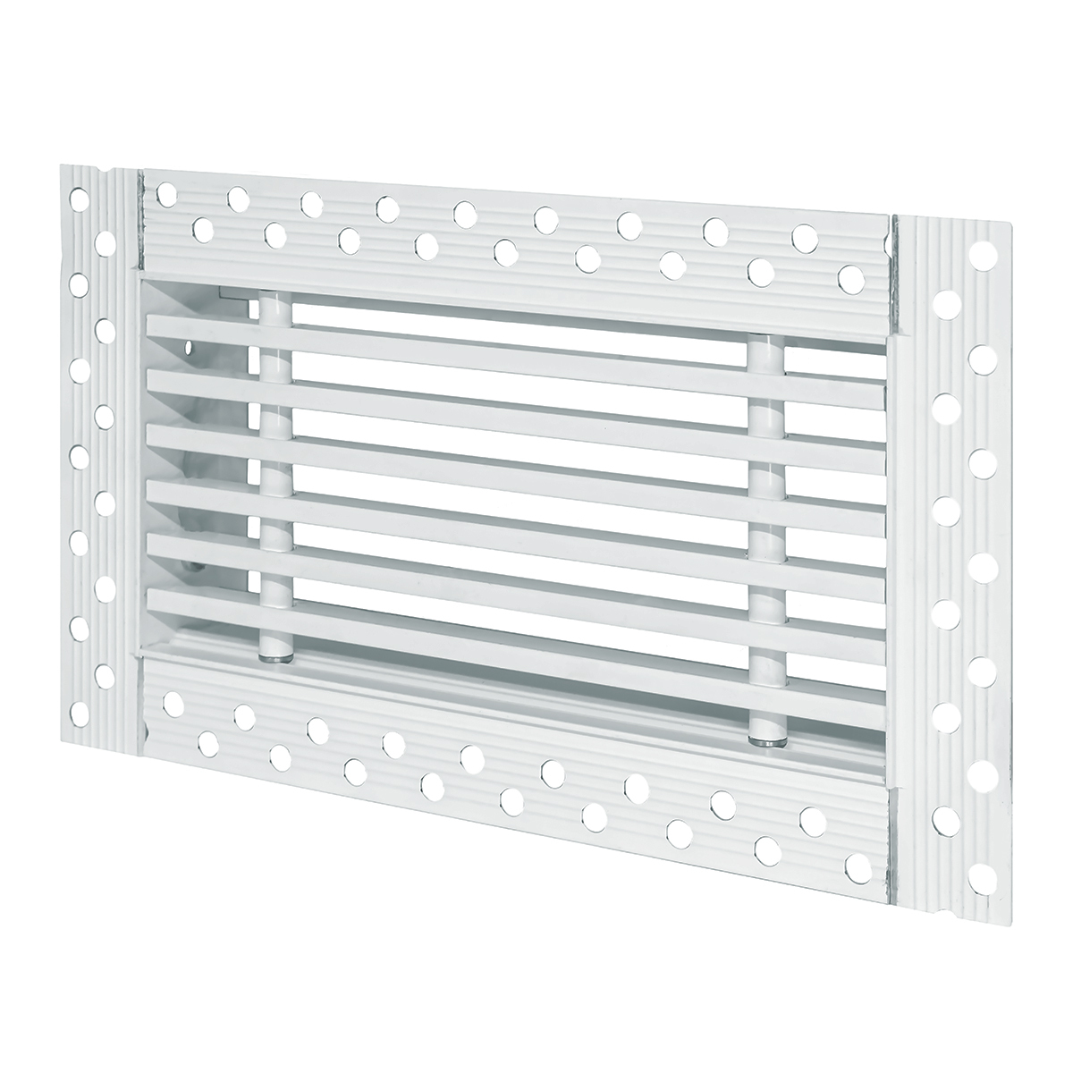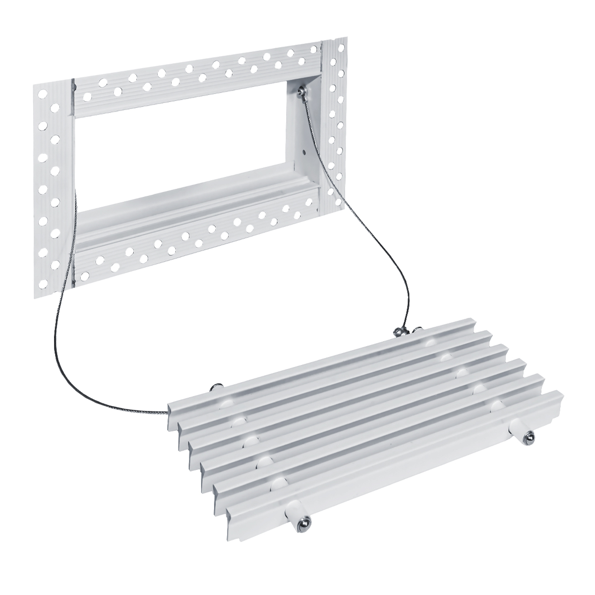 Данная решетка подходит для монтажа на любую поверхность под финишную отделку. Рамка и экран изготовлены из алюминия, опора экрана - из оцинкованной стали. Рама оснащена «полкой» 1,9 мм и рифлеными краями для большей адгезии финишного материала – шпатлевки, цемента. Решетка имеет съемную центральную часть с фиксированным углом наклона ламелей 0°. Она крепится к корпусу прочными металлическими тросиками, легко снимается для очистки и удобного обслуживания.