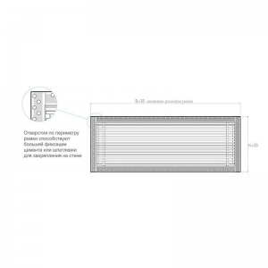 Данная решетка подходит для монтажа на любую поверхность под финишную отделку. Рамка и экран изготовлены из алюминия, опора экрана - из оцинкованной стали. Рама оснащена «полкой» 1,9 мм и рифлеными краями для большей адгезии финишного материала – шпатлевки, цемента. Решетка имеет съемную центральную часть с фиксированным углом наклона ламелей 15°. Она крепится к корпусу прочными металлическими тросиками, легко снимается для очистки и удобного обслуживания.